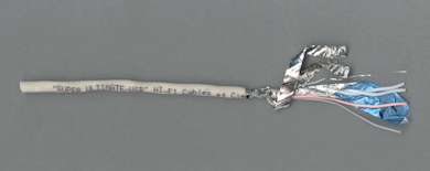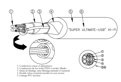 Ce câble USB a été réalisé comme une référence de ce qu'il était possible de réaliser dans ce standard. Les cores des deux conducteurs d'alimentation ont été augmentés pour réaliser de très grandes longueurs. Les liaisons de bus informations sont réalisées aussi en monobrin et isolées en PTFE à cavités. Une très faible coloration est utilisée dans les diélectriques pour le repérage.